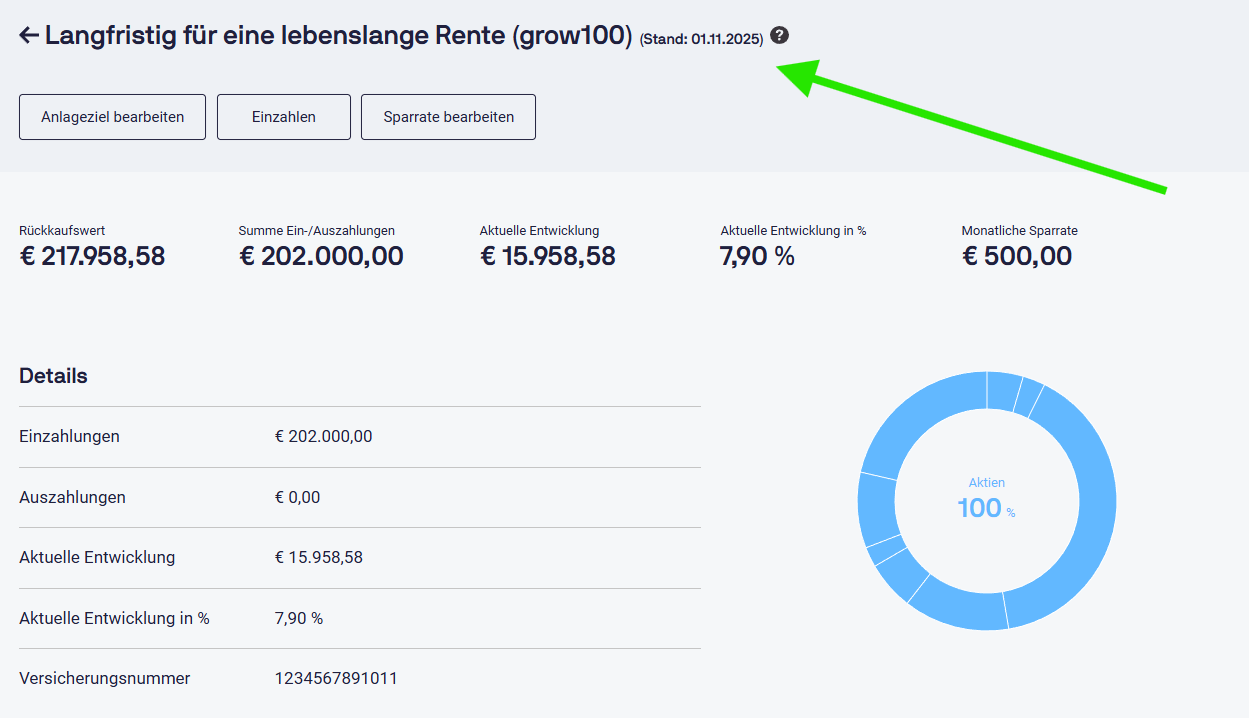 Die Buchungen und Berechnungen für Ihre Verträge in der Produktkategorie ETF-Rentenversicherung werden in der Regel einmal pro Woche am Samstag eingelesen und aktualisiert. In Ausnahmefällen (zum Beispiel beim Quartalswechsel oder beim Jahreswechsel) kann die Aktualisierung vom wöchentlichen Turnus abweichen.
